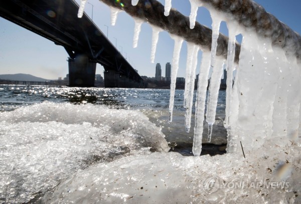 서울 최저기온 영하 17도를 기록하며 한파 경보가 발효된 24일 서울 뚝섬유원지 인근 한강이 얼어있다.