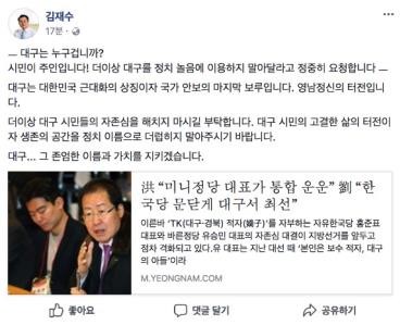 자유한국당의 대구시장 유력 후보로 떠오른 김재수 전 농림축산식품부 장관은 자신의 SNS에 “대구는 누구겁니까? 시민이 주인입니다!”라는 글을 올렸다.