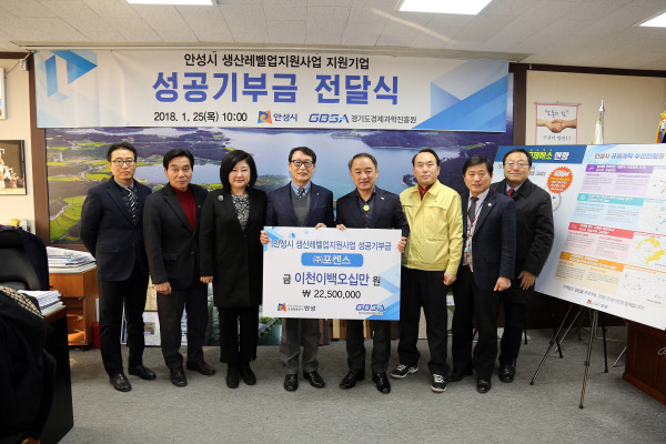 (주)포켄스는 25일 경기 안성시청 시장실에서 시와 경기도경제과학진흥원에 후배 기업을 위해 사용해달라며 ‘안성시 생산레벨업지원사업 지원기업 성공기부금’을 기탁했다. 사진은 성공기부금 전달식 후 관계자들이 기념촬영을 하는 모습. (사진제공=안성시청)