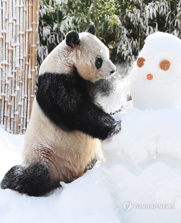 매서운 한파가 계속되고 있는 25일 오전 경기도 용인시 에버랜드에서 암컷 판다 아이바오가 눈사람으로 장난을 치고 있다.