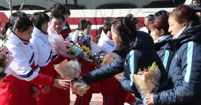 우리나라와 단일팀을 구성해 평창동계올림픽에 출전할 북한 여자 아이스하키 선수단이 25일 오후 충청북도 진천군 국가대표선수촌 빙상훈련장에 도착, 환영식에서 한국 아이스하키 대표 선수들이 꽃다발을 주고 있다.
