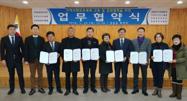 전남 장흥군 장흥읍지역사회보장협의체는 25일 지역사회보호체계 구축 및 복지자원 연계를 위해 지역내 5개 사회단체와 업무협약을 체결했다. 사진은 관계자들이 기념촬영을 하는 모습. (사진제공=장흥군청)
