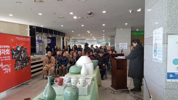 경기 이천시가 이달 24~26일 3일간 시청 2층 로비에서 지역내 불우이웃돕기를 위한 ‘이천 도자명장과 함께하는 행복한 도자 바자회’를 개최했다. 사진은 도자 바자회에서 진행된 프로그램에 참여한 방문객들이 각종 도자에 대한 설명을 듣고 있는 모습. (사진제공=이천시청)