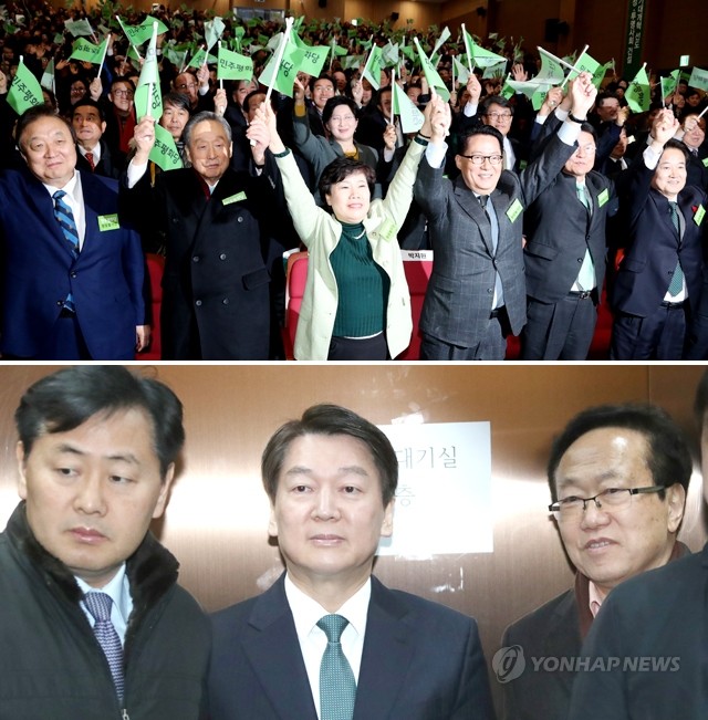 민주평화당 창당준비위원장인 국민의당 조배숙 의원과 박지원 천정배 정동영 의원, 권노갑 정대철 고문 등 참석자들이 28일 국회 의원회관에서 열린 창당발기인대회에서 손을 들어 구호를 외치고 있다(위). 국민의당 안철수 대표(가운데)가 28일 여의도 당사에서 열린 당무위원회에 참석하기 위해 당사에 들어서 엘리베이터에 타고 있다. 왼쪽 김관영 사무총장.