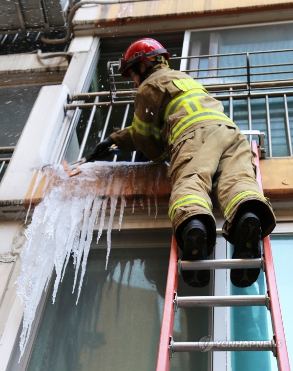 29일 오전 서울 광진구 자양동의 한 아파트에서 소방대원이 얼어붙은 고드름을 제거하고 있다.
