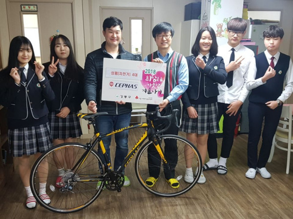 서울 강동구가 최근 (주)세파스와 함께 대안학교 죠이플제자 크리스천 학교와 꿈터 학교 학생을 위해 자전거 10대를 기부했다. 사진은 자전거 기부를 기념해 대안학교 학생과 기부 관계자가 기념촬영을 하는 모습. (사진제공=강동구청)