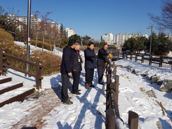 최근 경기 동두천시 여규만 안전도시국장이 2018년 새해를 맞아 공원녹지과 2018년 주요 사업현장을 방문해 추진현황과 애로사항을 청취했다. 사진은 주요시설 및 사업현장의 시설 현장을 둘러보면서 이야기를 나누고 있는 관계자들의 모습. (사진제공=동두천시청)
