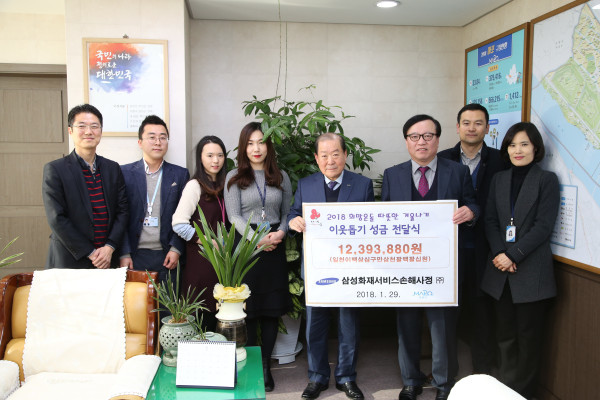 29일 오후 마포구청에서 열린 '2018 희망온돌 따뜻한 겨울나기사업 성금기탁식'에서 삼성화재서비스손해사정(주)가 성금 1239만3000원을 마포구에 전달했다. 사진은 구청장 및 관계자들이 기념촬영을 하는 모습. (사진제공=마포구청)