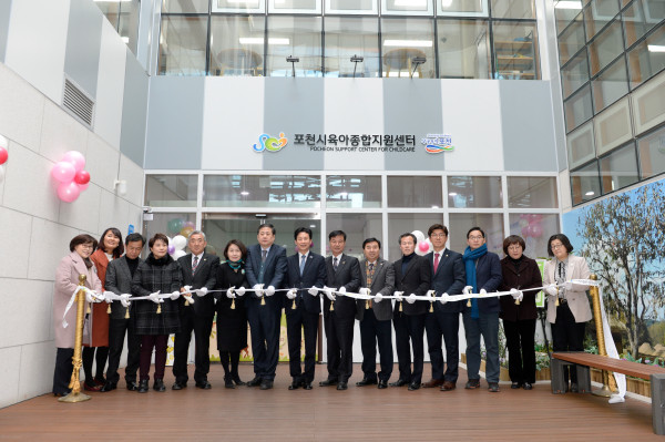경기 포천시는 지난 26일 시장과 시·도의원, 육아종합지원센터 관계자, 어린이집 원장, 영·유아 부모 등이 참석한 가운데 육아지원을 위해 조성한 '포천시육아종합지원센터'의 개소식을 개최했다. 사진은 관계자들이 개소식에서 테이프 커팅을 하고 있는 모습. (사진제공=포천시청)