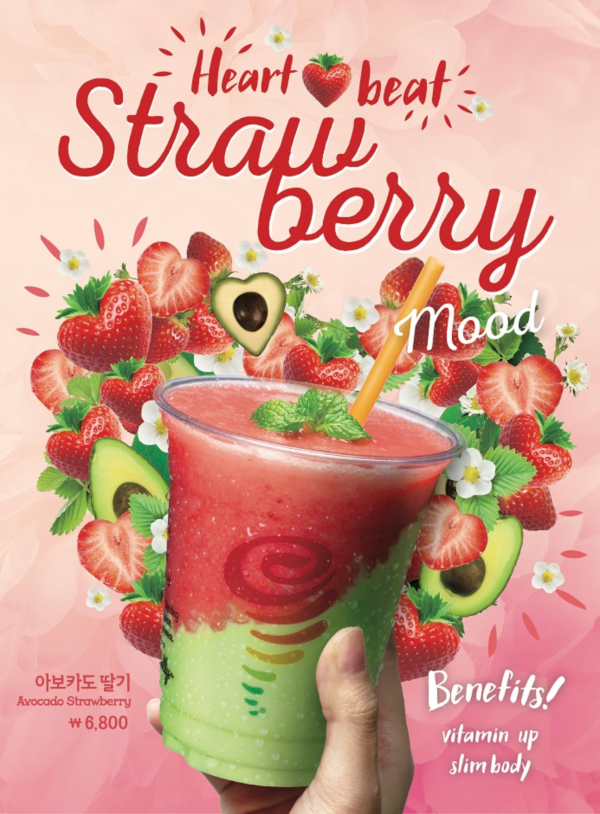 이번에 출시한 음료 7종은 ▲아보카도 딸기 주스 ▲딸기 멜랑쥬(Iced/Hot) ▲딸기 요거트 ▲생(生) 딸기 우유 ▲딸기 말차 라떼 ▲‘딸기 에너지 보울’, ‘생딸기 주스’다.