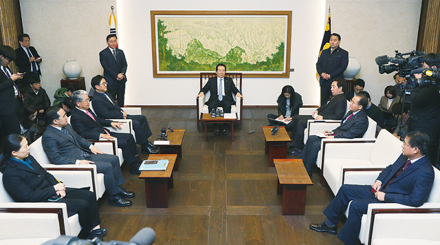 정세균 국회의장과 여·야 3당 원내대표가 30일 오전 국회의장실에서 회동을 하고 있다.