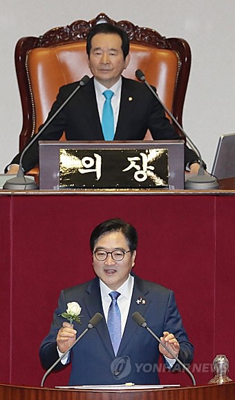더불어민주당 우원식 원내대표가 31일 오전 국회 본회의에서 교섭단체 대표연설을 하기 전 하얀 장미를 들고 성추행 피해를 폭로한 서지현 검사를 응원하고 있다.