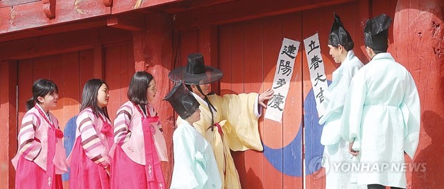 24절기의 첫 번째인 입춘(立春)을 나흘 앞둔 지난 31일 경남 함양군 함양향교에서 유림과 어린이들이 입춘대길(立春大吉), 건양다경(建陽多慶) 등 직접 쓴 입춘첩을 붙이고 있다.