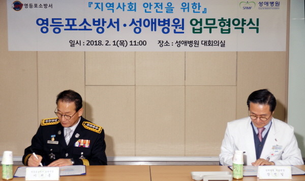 영등포소방서는 지난 1일 성애병원 대회의실에서 소방공무원과 성애병원 양 기관 관계자들이 참석한 가운데 시민의 소중한 생명을 보호하고 상호 우호 증진과 긴밀한 협력을 도모하기 위한 업무협약(MOU)을 체결했다. 사진은 소방서장과 의료원장이 협약서에 서명을 하는 모습.(사진제공=영등포소방서)