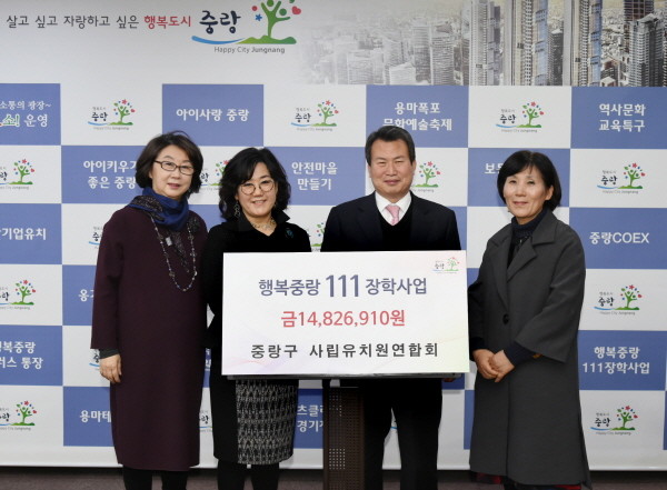 중랑구 사립유치원연합회은 지난달 31일 중랑구청에 ‘행복중랑 111 장학사업’ 기탁금 1480여만원을 전달했다. 사진은 구청장 및 관계자들이 기념촬영을 하는 모습.(사진제공=중랑구청)