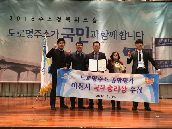 경기 이천시는 지난달 31일 행정안전부가 주관한 ‘2018년 주소정책 워크숍’에서 2017년 도로명주소 업무 전국 평가 우수기관으로 선정돼 국무총리 표창을 수상했다. 사진은 시 관계자들이 기념촬영을 하는 모습.(사진제공=이천시청)