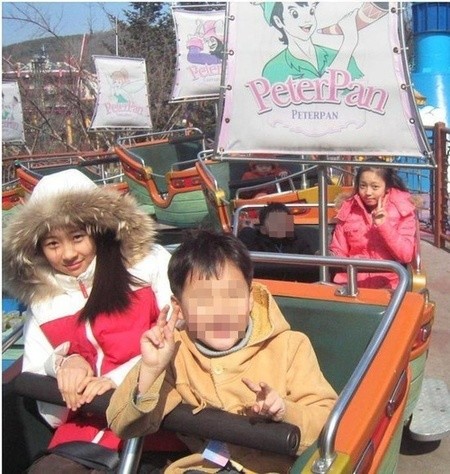 사진 속 구하라와 선미는 남자 어린이들과 함께 놀이기구에 탑승해 카메라를 바라보고 있는 모습.