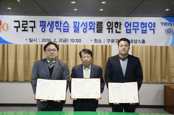 지난 2일 서울 구로구가 구청 르네상스홀에서 (주)트리시스, (주)한국지식교육협회와 업무협약을 체결하고 구민들의 평생학습 활성화를 위해 상호협력해 나갈 방침이다. 사진은 관계자들이 협약서에 사인한 후 기념촬영을 하고 있는 모습. (사진제공=구로구청)