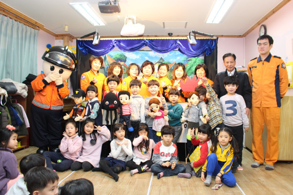 경기 이천소방서는 지난 2일 소방안전교육의 다양화 및 어린이들의 생동감 있는 창의적 소방안전교육을 위한 ‘119안전 인형극’을 공연했다. 사진은 공연이 끝난 후 어린이들이 소방서 관계자들과 기념촬영을 하는 모습. (사진제공=이천소방서)
