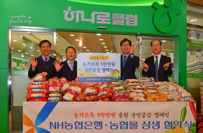 [시민일보=이진원 기자]NH농협은행은 5일 서울 중구 하나로마트 서대문점에서 농협경제지주의 농축산물 전문 인터넷쇼핑몰인 ‘농협몰’과 상생협약식을 개최하고, ‘농가소득 5000만원 달성 국민공감 캠페인’을 올해 말까지 연중 실시한다고 밝혔다.