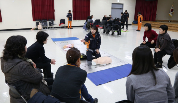 경기 연천소방서는 6일 소방서 대회의실에서 지역내 자동심장충격기를 설치한 기관 중 연천군보건의료원, 시설관리공단, 노인복지관, 효사랑병원 관리자 40여명이 참석한 가운데 자동심장충격기 및 심폐소생술 교육을 실시했다. 사진은 소방관이 심폐소생술에 대해 설명하는 모습. (사진제공=연천소방서)