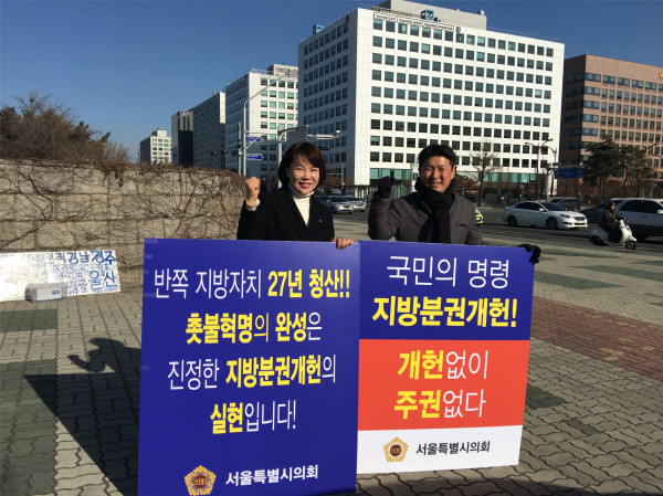 [시민일보=이진원 기자] 서울시의회 더불어민주당이 국회 정문 앞에서 ‘지방분권 개헌 촉구를 위한 릴레이 1인 시위’를 이어가고 있다.