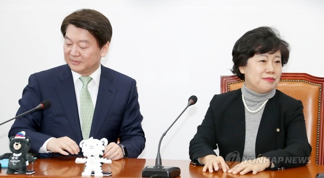 국민의당 안철수 대표가 7일 국회 대표실을 예방한 민주평화당 조배숙 대표와 대화 도중 서로 다른 곳을 보고 있다.