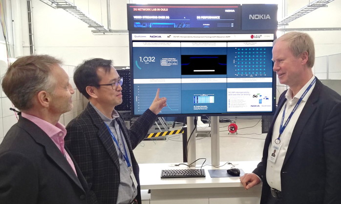 | ▲ 김대희 LG유플러스 상무와 노키아 프로덕트 매니저, 퀄컴 시니어 디렉터가 핀란드 노키아 본사에서 3사 관계자들이 5G 데이터 전송 시험을 하고 있는 모습.(사진제공=LG유플러스) | ||