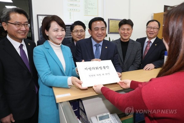 더불어민주당 전현희 의원이 8일 오전 서울시의회 의원들과 국회 본청 의안과에 지방의회법률안 제정법을 발의하고 있다. 지방의회법률안은 지자체와 지방의회 사이의 견제와 균형을 확립하고 지방의회의 조직, 운영 등 전반을 아우르고자 하는 제정법이다. 왼쪽에서 두 번째 전현희 의원, 왼쪽에서 세 번째 양준욱 서울시의회 의장.