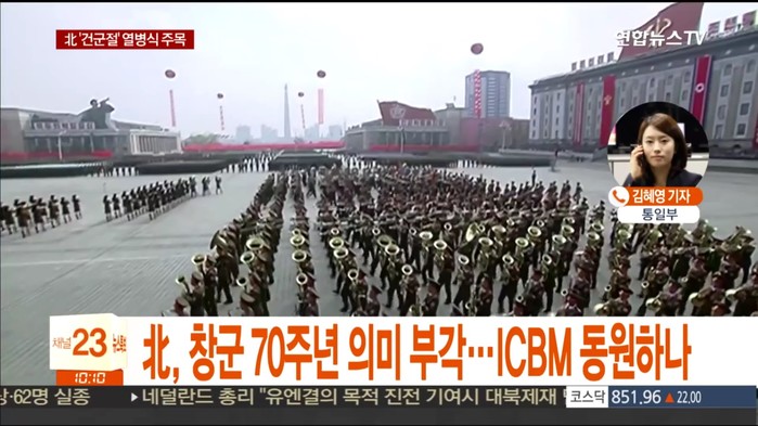 8일 북한은 평양시에 위치한 김일성광장에서 열병식을 진행할 것으로 알려졌다. 이 열병식은 북한의 '건군절 70주년'을 기념한 행사다. 북한은 이 열병식에 주요 외신들의 취재를 허락하지 않고, 중국 정부 인사도 초청하지 않았다.