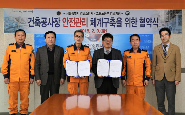 강남소방서는 지난 9일 오후 고용노동부 강남지청과 건축공사장의 안전사고를 예방하고 대응하기 위한 업무협약(MOU)를 체결했다. 사진은 소방서장 및 관계자들이 협약서를 들고 기념촬영을 하는 모습. (사진제공=강남소방서)