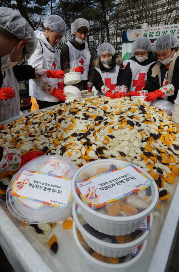 설명절을 맞아 쪽방촌 소외 이웃을 위한 봉사활동에 나선 대한적십자사 봉사원과 시민들이 12일 오전 서울 용산구 동자동 새꿈어린이공원에서 동자동 일대 주민 800가구에 전달할 삼색 떡국 떡을 포장하고 있다.