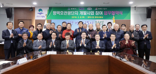 경기 평택도시공사는 최근 시청 종합상황실에서 (주)플레이앤케어와 (주)이도 대표가 참석한 가운데 평택호관광단지 개발 사업 참여 협약식을 체결했다. 사진은 업무협약식 후 기념촬영을 하고 있는 협약식 참가자들의 모습.