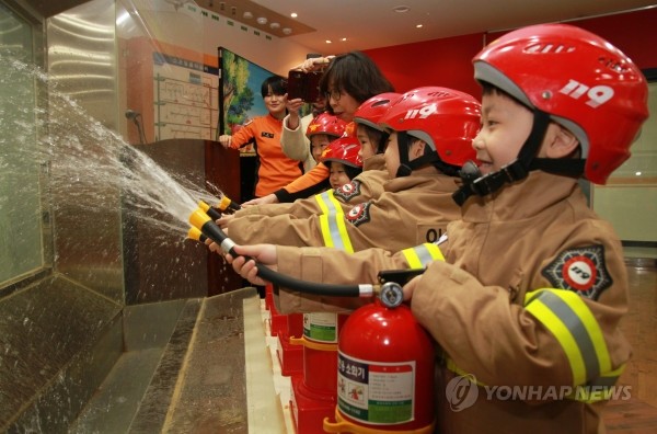 서울 마천동 송파소방서 3층 안전체험교실에서 어린이들이 물소화기 체험을 하고 있다.