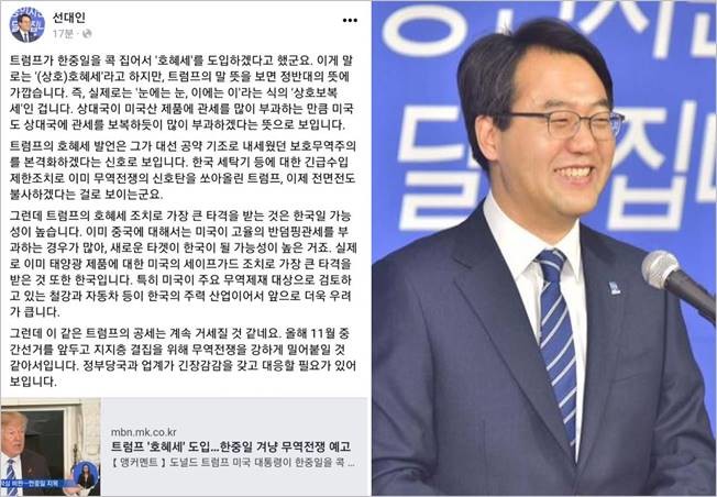 경제평론가 선대인 소장은 자신의 SNS에 “트럼프가 한중일을 콕 집어서 ‘호혜세’를 도입하겠다고 했군요. 이게 말로는 ‘(상호)호혜세’라고 하지만, 트럼프의 말 뜻을 보면 정반대의 뜻에 가깝습니다. 즉, 실제로는 ‘눈에는 눈, 이에는 이’라는 식의 ‘상호보복세’인 겁니다. 상대국이 미국산 제품에 관세를 많이 부과하는 만큼 미국도 상대국에 관세를 보복하듯이 많이 부과하겠다는 뜻으로 보입니다.”라고 설명했다.