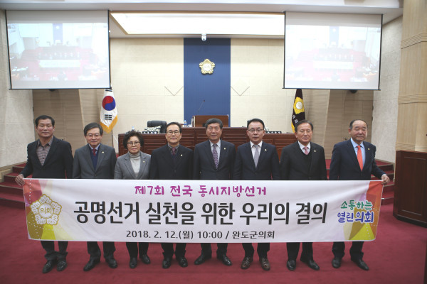 [완도=신흥권 기자] 전남 완도군의회는 최근 제255회 임시회 제5차 본회의에 앞서 오는 6월13일 실시되는 제7회 전국 동시지방선거가 공명정대하게 치러지도록 제7대 의회 의원 모두가 공명선거 실천을 다짐하고 결의하는 자리를 마련했다.