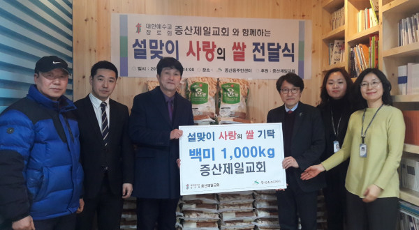 서울 은평구 증산동 주민센터는 설을 맞아 최근 증산제일교회에서 기증한 사랑의 쌀 1000kg 나눔행사를 가졌다. 기증된 쌀은 동 저소득 주민 100가구에 10kg씩 전달할 예정이다. 사진은 행사에 참여한 관계자들이 기념촬영을 하는 모습. (사진제공=은평구청)