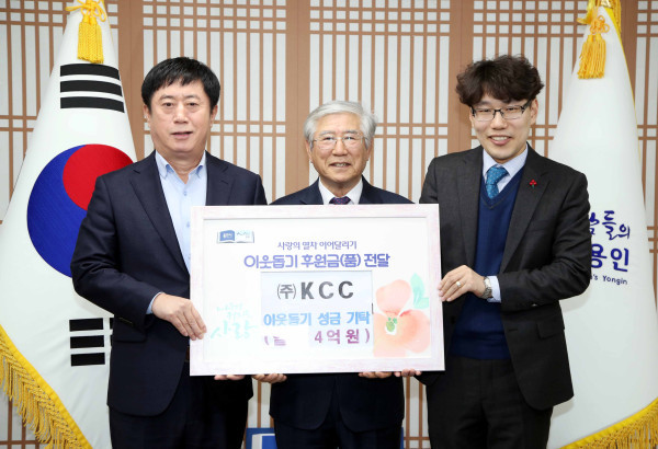 경기 용인시는 12일 이정대 (주)KCC중앙연구소 소장과 강성훈 경기사회복지공동모금회 본부장이 참석한 가운데 KCC로부터 이웃돕기 운동인 ‘사랑의 열차 이어달리기’의 일환으로 성금 4억원을 기탁받았다. 사진은 기탁식 후 관계자들이 기념촬영을 하는 모습. (사진제공=용인시청)