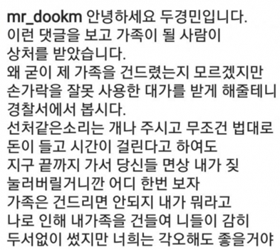 두경민은 또 "선처같은 소리는 개나 주시고 무조건 법대로 해서 당신들 면상 내가 짓눌러 버릴 거니깐 어디 한 번 보자. 가족은 건드리면 안 되지 내가 뭐라고. 너희는 각오해도 좋을거야"라며 악플러들을에게 강경대응할 것이라 말했다.