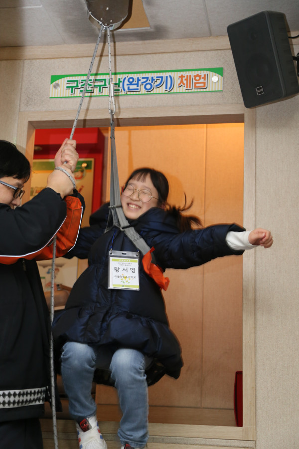 영등포소방서는 지난 14일 오후 꿈나무 영등포 어린이 명예 기자단 16명을 대상으로 미래소방관 직업체험교실을 운영했다. 사진은 교육에 참여한 학생이 완강기 체험을 하고 있는 모습. (사진제공=영등포소방서)