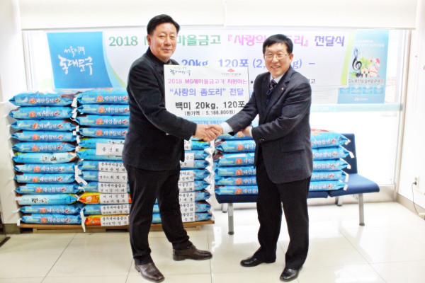 19일 동대문구에 소재한 용두새마을금고에서는 조합원들이 모은 '좀도리 쌀' 20kg 120포(2400kg)를 동대문구 용신동에 전달했다. 사진은 관계자들이 기념촬영을 하는 모습. (사진제공=동대문구청)