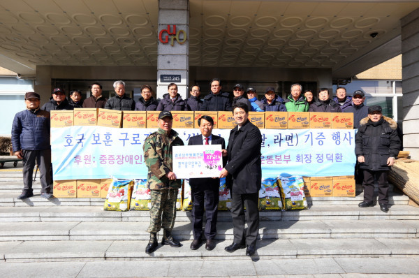 최근 중증장애인의 평생일터 행복공장만들기 운동본부는 호국보훈구로경로당 노인들을 위해 구로구청에 라면 100박스, 백미 50포 등 300만원 상당의 후원물품을 기탁했다. 사진은 구청 현관에서 행복공장만들기 운동본부, 호국보훈구로경로당, 구청 관계자들이 기념촬영을 하고 있는 모습.(사진제공=구로구청)