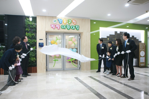 강동구가 지난 20일 오전 10시 구청 본관 1층에서 '강동구청 직장어린이집 이전 개원식'을 개최했다. 사진은 어린이집 현판 제막식이 진행 중인 모습. (사진제공=강동구청)