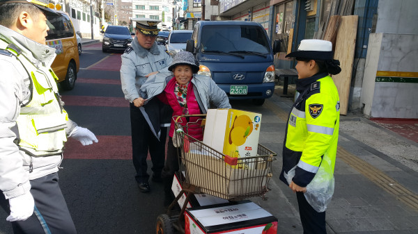 인천중부경찰서는 20일 폐지수집 노인에게 빛 반사 바람막이를 배부하며 야간 보행 안전을 위한 교통안전수칙에 대해 설명했다. 사진은 노인이 바람막이를 입어보는 모습. (사진제공=인천중부경찰서)