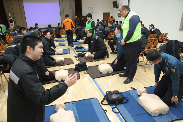 서울 관악소방서는 21일 오전 소방서 강당에서 관악경찰서 의무경찰 80여명을 대상으로 각종 재난재해 상황에 대응할 역량을 길러주는 '시민안전파수꾼 양성교육'을 실시했다. 사진은 심폐소생술 교육이 진행 중인 모습. (사진제공=관악소방서)