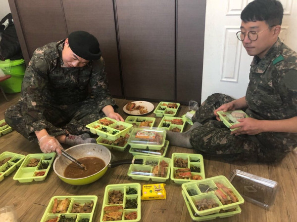 경기 양평군 옥천면 20사단 질풍봉사단은 최근 지역내 홀몸노인, 장애인 12가구를 방문해 사랑의 도시락과 함께 한과세트를 전달했다. 사진은 장병들이 도시락에 음식을 담고 있는 모습. (사진제공=양평군청)