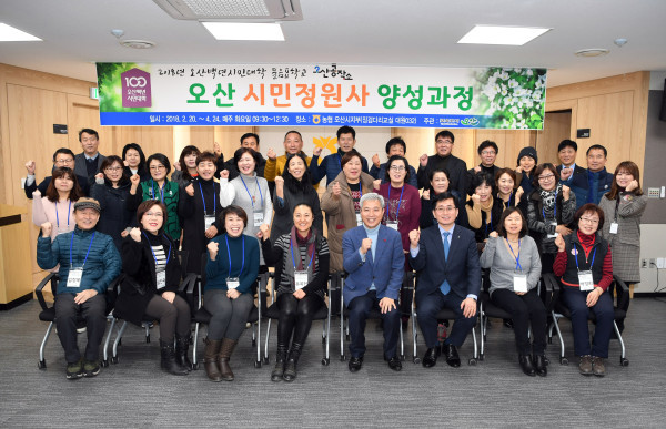 경기 오산시는 지난 20일 생활속 정원문화 확산과 시민과 함께하는 정원 조성을 위해 마련한 ‘오산 시민정원사 양성과정’의 개강식을 개최했다. 사진은 시민정원사 양성과정 개강식에 참석한 관계자들이 기념촬영 중 '파이팅'을 외치는 모습. (사진제공=오산시청)