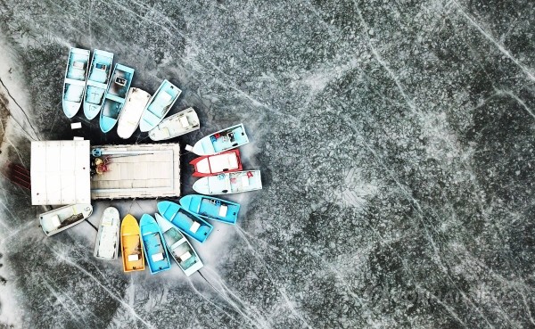 22일 오후 경기도 안성시 금광저수지 낚싯배들이 아직 녹지 않은 얼음 속에서 봄을 기다리고 있다.