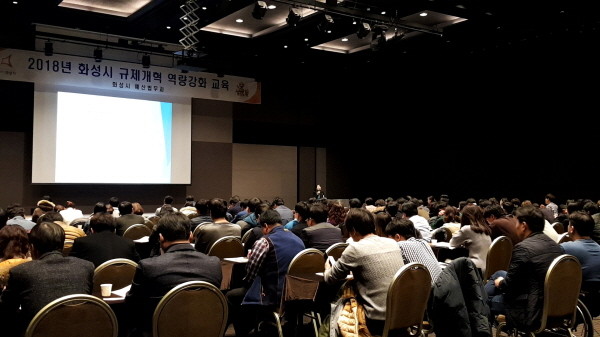 경기 화성시가 불합리한 규제 개선을 위해 최근 시청 대강당 및 라비돌 리조트에서 공직자 470여명을 대상으로 역량강화 교육을 실시했다. 이번 교육에서는 정부의 규제 정책 방향인 네거티브 규제의 이해와 신산업 적용사례 등을 교육했다. 사진은 교육을 듣는 시 공직자들의 모습.(사진제공=화성시청)