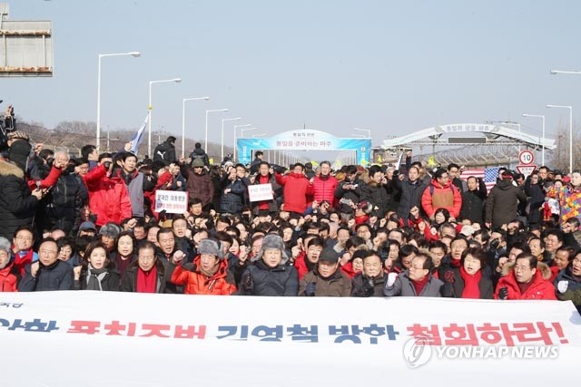25일 오전 자유한국당 홍준표 대표, 김성태 원내대표 및 김무성의원등 당 소속 의원들과 당원들이 김영철 북한 노동당 중앙위원회 부위원장 겸 통일전선부장의 방한을 저지하기 위해 통일대교 남단을 점거한 채 시위하고 있다.